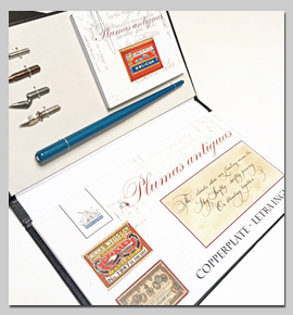 El repertorio que presentamos permite escribir con cuatro tipos de plumas fabricadas con la elasticidad requerida para los rasgos de la Copperplate.